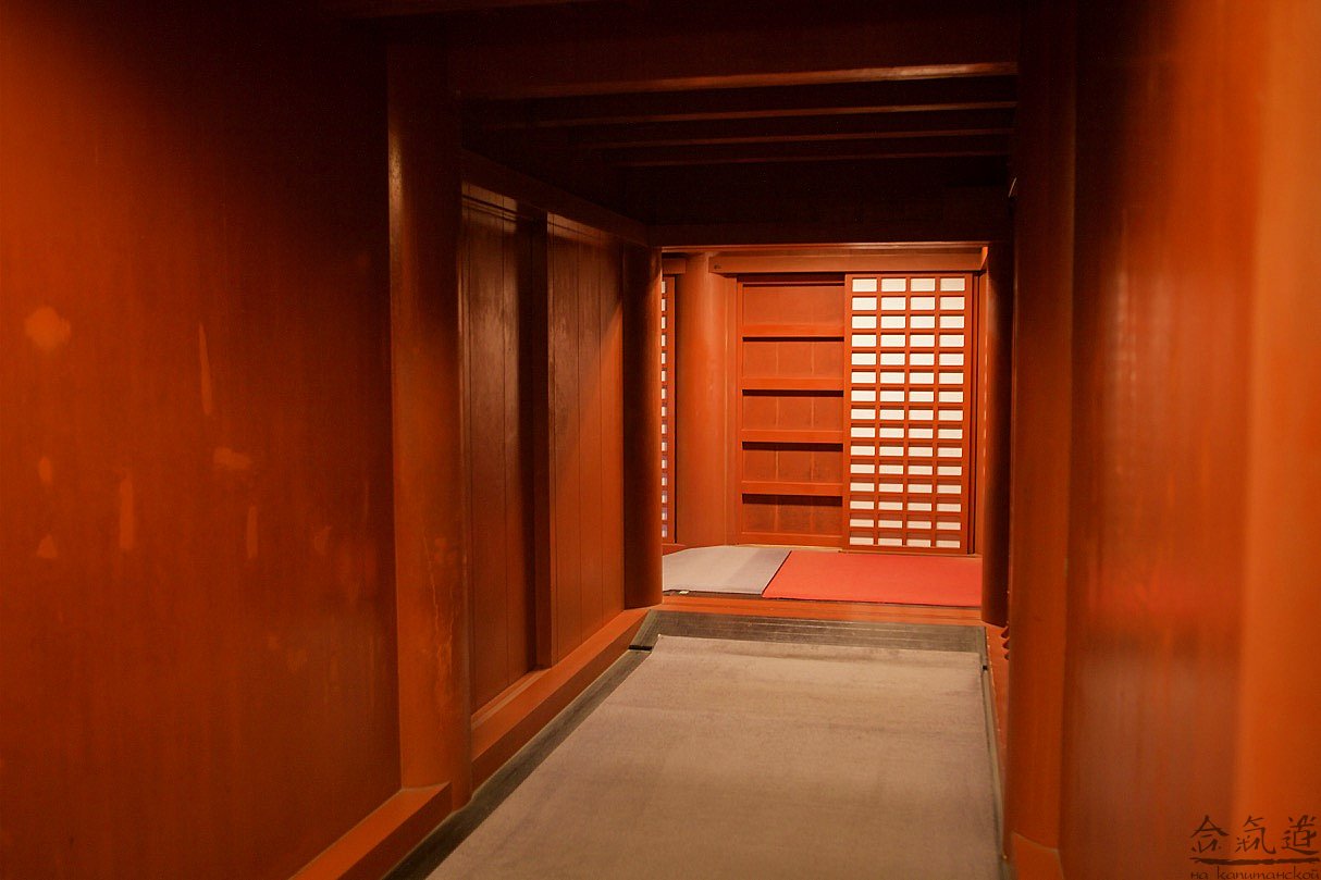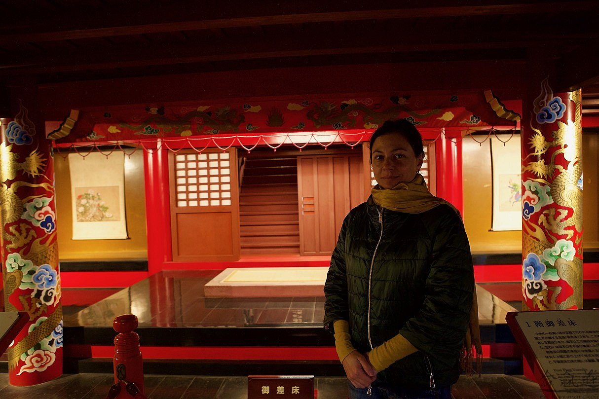 Экспозиция Сюри дзе небогата. В основном это комнаты: комнаты большие, комнаты поменьше и комнаты совсем маленькие. Еще есть узкие коридоры и тронный зал. Однако назвать Сюри дзе пустым не поворачивается язык. Весь замок заполнен по крышу ароматом самшита. Или кедра. Тут мнения наших экспертов разошлись:). Самшитом-кедром обшиты полы, стены и потолки замка. Полировка потрясающая. Никогда еще не видел я такой гладкой и приятной на ощупь древесины. Подгонка деталей тоже на высоте. Но все же для меня на первом месте оказалось не мастерство японских строителей-реставраторов, а ароматы тропического дождя и самшита, смешавшиеся и навсегда ставшие визитной карточкой Сюри дзе.